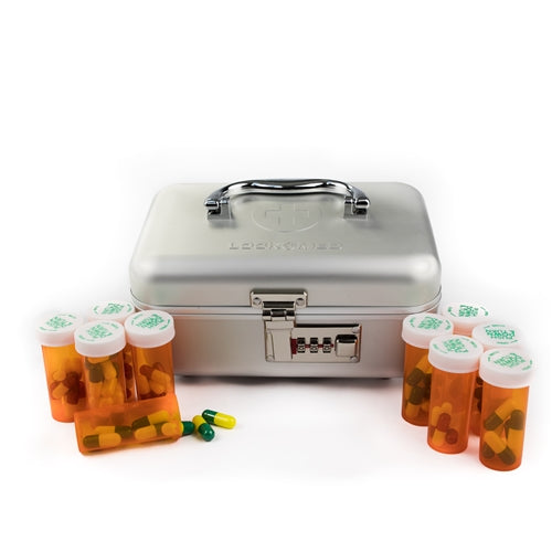 Solid All Aluminum Small Combination Lock Medication Container designed to safeguard prescription medications at home, school, work, or during travel.
